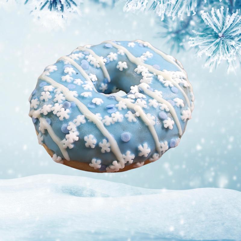 Winterzauber-Donut Verwöhne dich mit unserem festlichen Winterdonut! Sanft pastellblauer Zuckerguss, zarte Schneeflocken-Dekoration und ein fluffiger Teig mache...